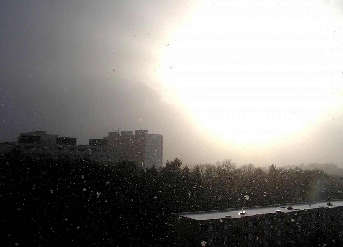 Zataženo, sněží, tlak 1010,7hPa, dohlednost 700m, vlhkost 93,3%, čerstvý S vítr 5° 8,1m/s(5 Bft), zákl.mraků 286m.