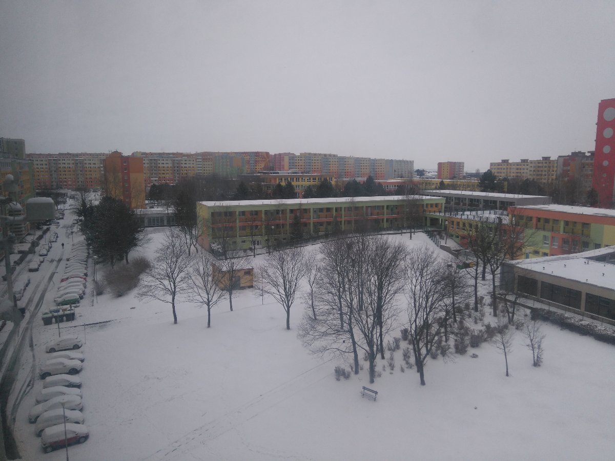 Ráno napadl poprašek sněhu. Slabý vítr, tlak 1004 hPa, vlhkost 87%.