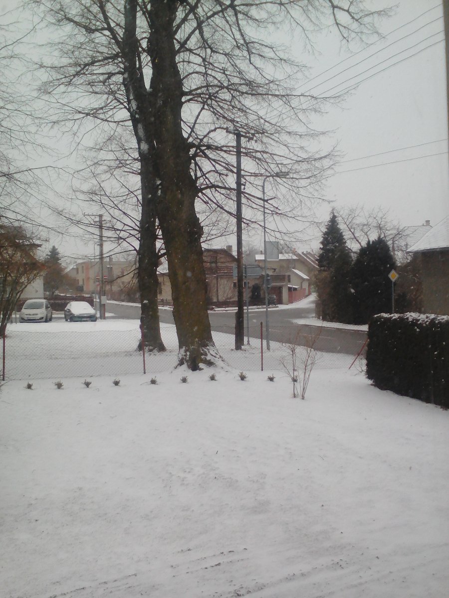 Slabě sněží, před chvílí sněžilo mírně. Slabý až mírný vítr, tlak 1003 hPa, vlhkost 80%. Je tady poprašek sněhu rozvátý větrem.