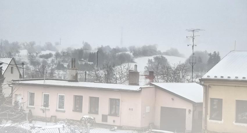 foto 2013 01 21 v 11:40 Kenny si užívá sníh - na chodníčku je znát, že něco padalo a teď je mlhavo