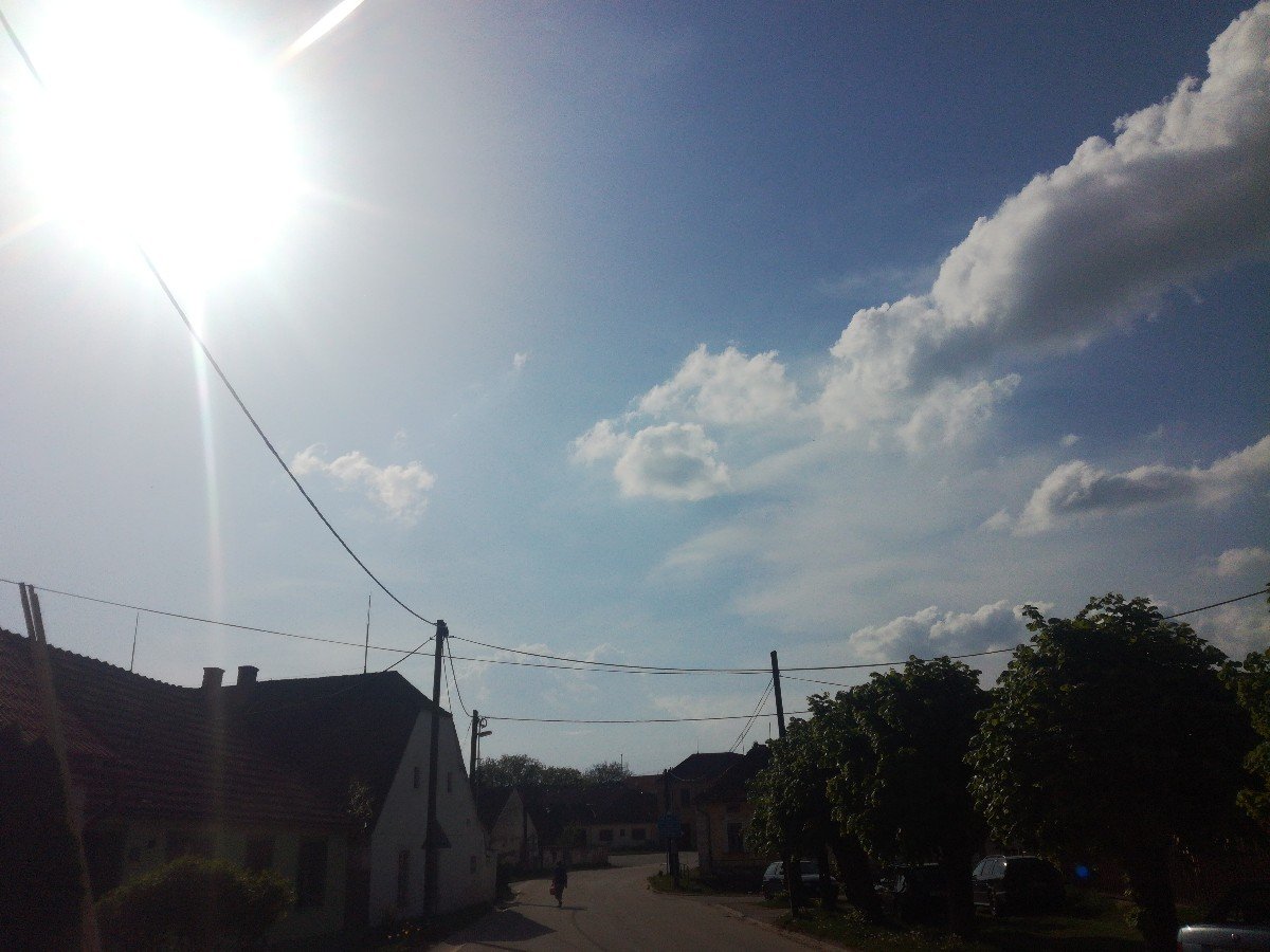 Velmi teplé počasí stále pokračuje. Je bezvětří a tlak 1008 hPa. Na severovýchodním obzoru je vidět vzdálená bouřka.