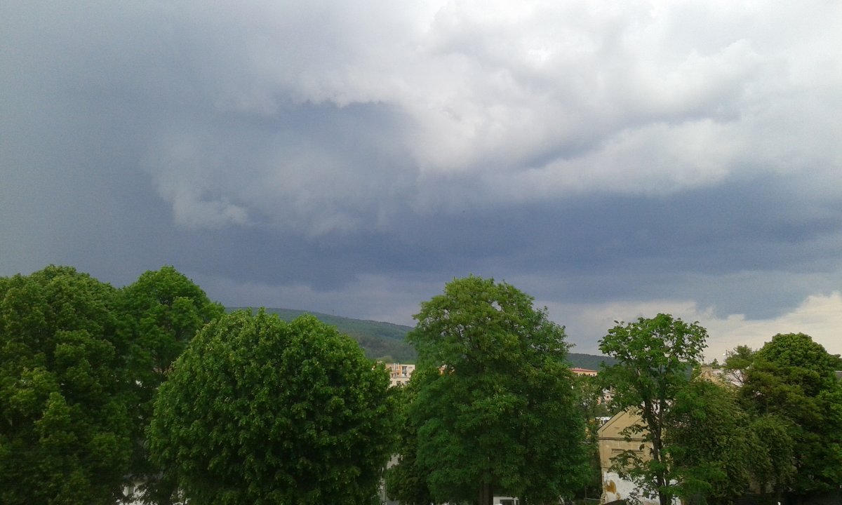 Blíží se bouřka, začíná pršet, hřmí a sem tam jde vidět blesk