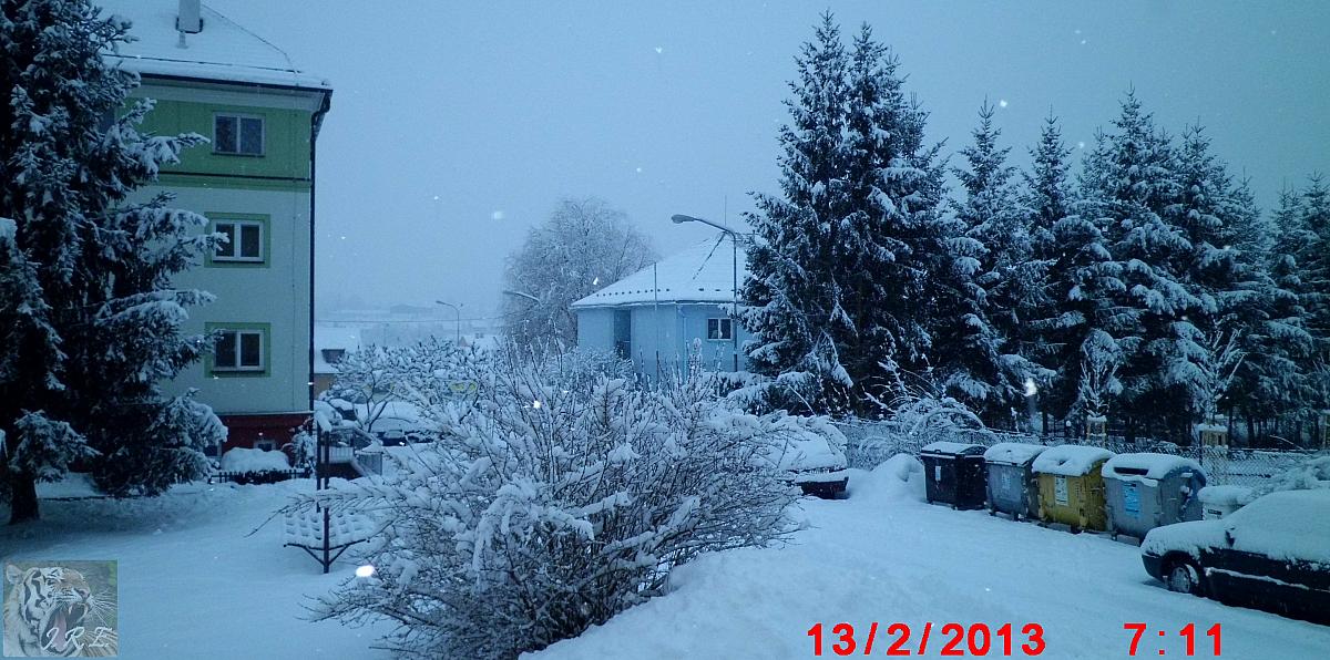 Zataženo, zákl.mraků 433m, sněží(přes noc připadlo 13cm), tlak1016,1hPa, dohlednost 2km, vlhkost 96,4%, slabý ZSZ vítr 286° 2m/s(2 Bft).