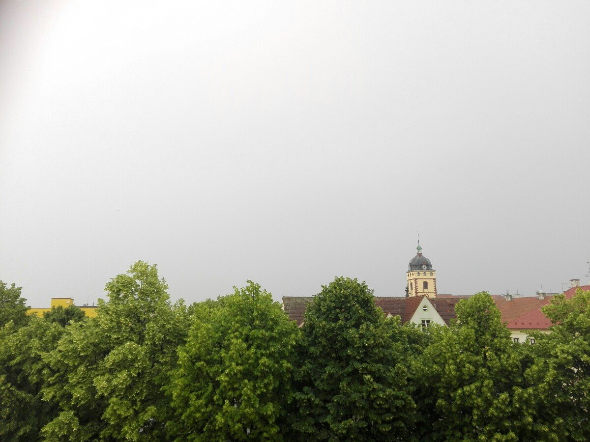 zataženo nízkou oblačností, kterou rozfoukává V vítr 17 km/hod, hřmí ze vzdálené bouřky, vlhkost 87%